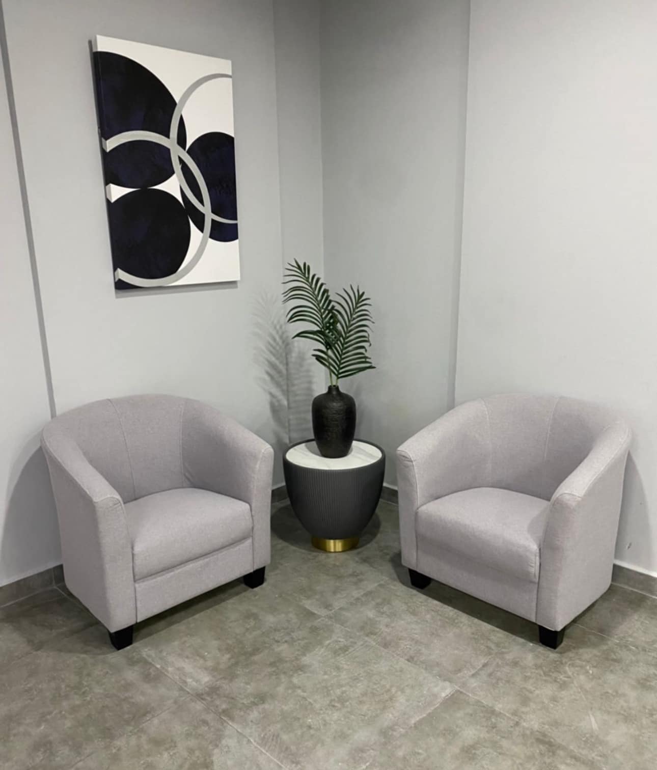 A calm and elegant corner for visitors and staff, featuring light gray seating, minimalist artwork, and greenery for balance and warmth.