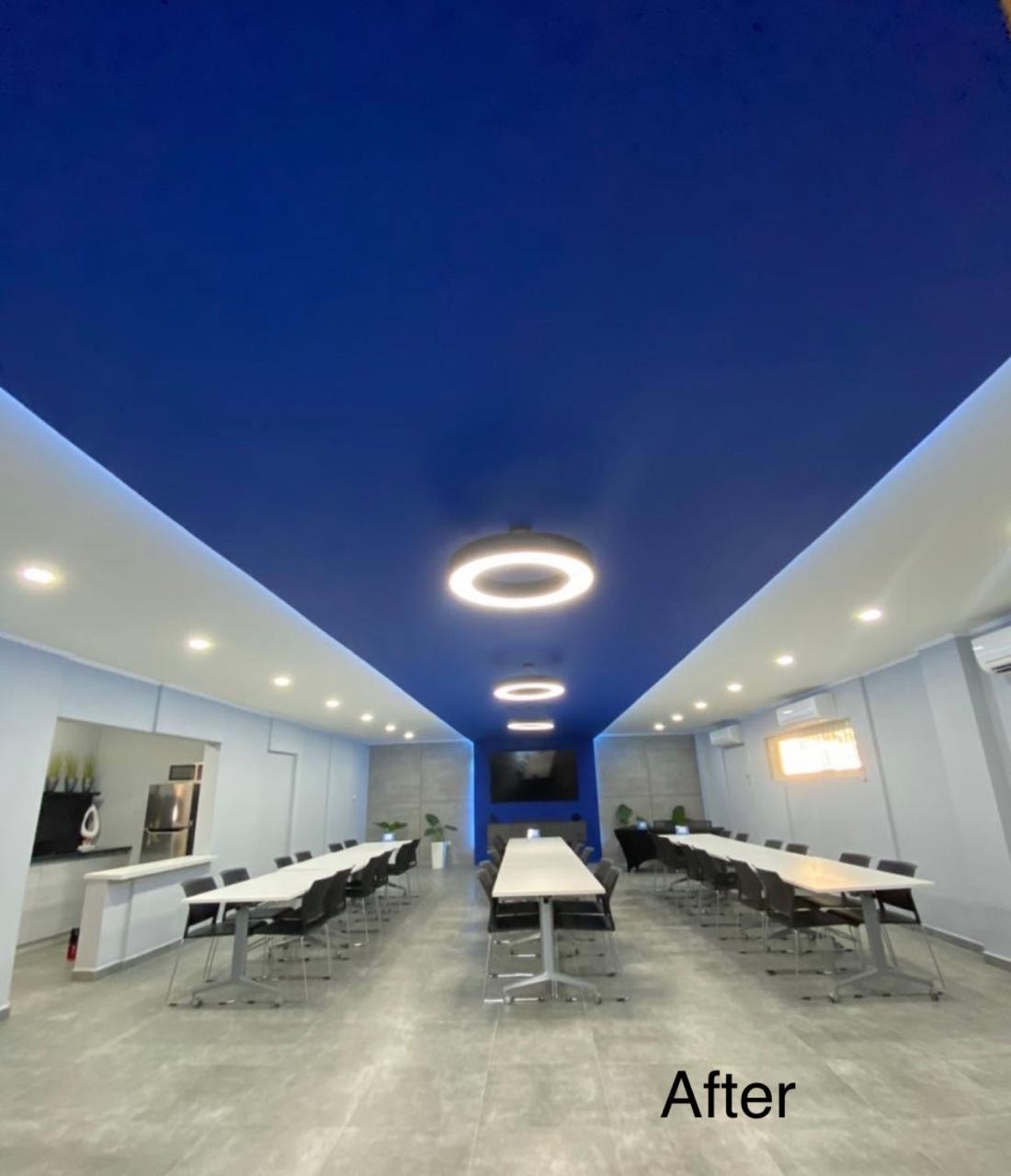 Once a simple classroom, this space was fully transformed with a bold blue ceiling, modern circular pendant lighting, and integrated LED accents. The room now supports flexible use—from workshops to board meetings—while maintaining a polished, energizing atmosphere.