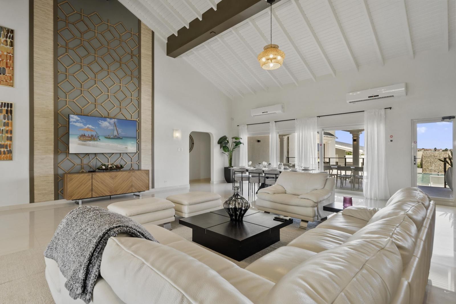 A spacious and inviting open-concept living area forms the heart of the home. Floor-to-ceiling windows fill the space with natural light and frame views of the pool and gardens. Plush seating, high ceilings, and warm neutral tones create a refined yet relaxed atmosphere. Perfect for entertaining or unwinding, this living space combines luxury finishes with an effortless Caribbean charm.