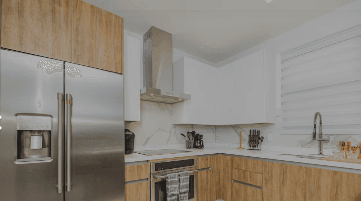 A centerpiece of modern design and practicality, the kitchen features wood-grain cabinetry, sleek white countertops, and integrated appliances. The breakfast bar connects seamlessly with the living area, creating a social hub ideal for both entertaining and everyday living.