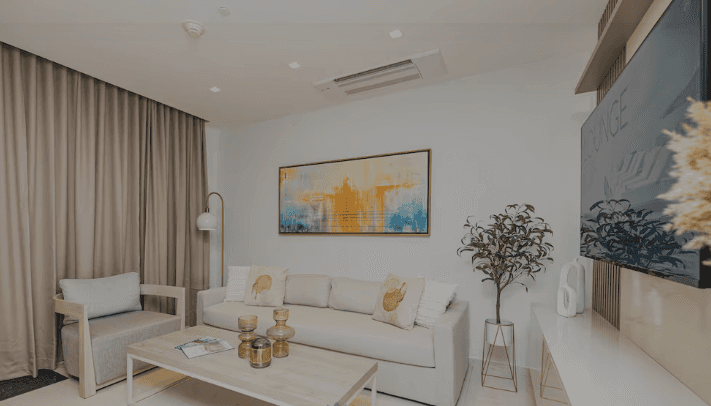 The living area exudes comfort and understated sophistication. Soft neutral seating is complemented by natural wood accents and modern wall slats framing the entertainment center. The decor combines organic elements with abstract art, adding a serene yet vibrant energy to the space.